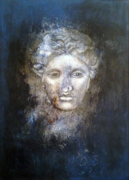 The paintings are structured around four narratives: Cemetery, Dark Interior, Museum and TV Screen. These correspond roughly with the Vesica, Votive and Mythologies paintings while the most recent paintings (Untimely Fragments) depart from the idea of archaic time to reflect on the temporal imagery of the TV and computer screen captured in a specific moment of electronic dissolution. Some of the paintings in this fourth narrative also draw on previous themes.